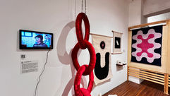 대표 설치미술 연작인 ‘사슬(Chains)’ 시리즈는 억압과 연대, 속박과 자유라는 상반된 개념을 부드러운 섬유로 엮어내는 작업입니다. 천장에서 길게 늘어진 벨벳 체인은 떨어질 듯 위태로우면서도 바닥과 또 다른 연결을 만들어냅니다.